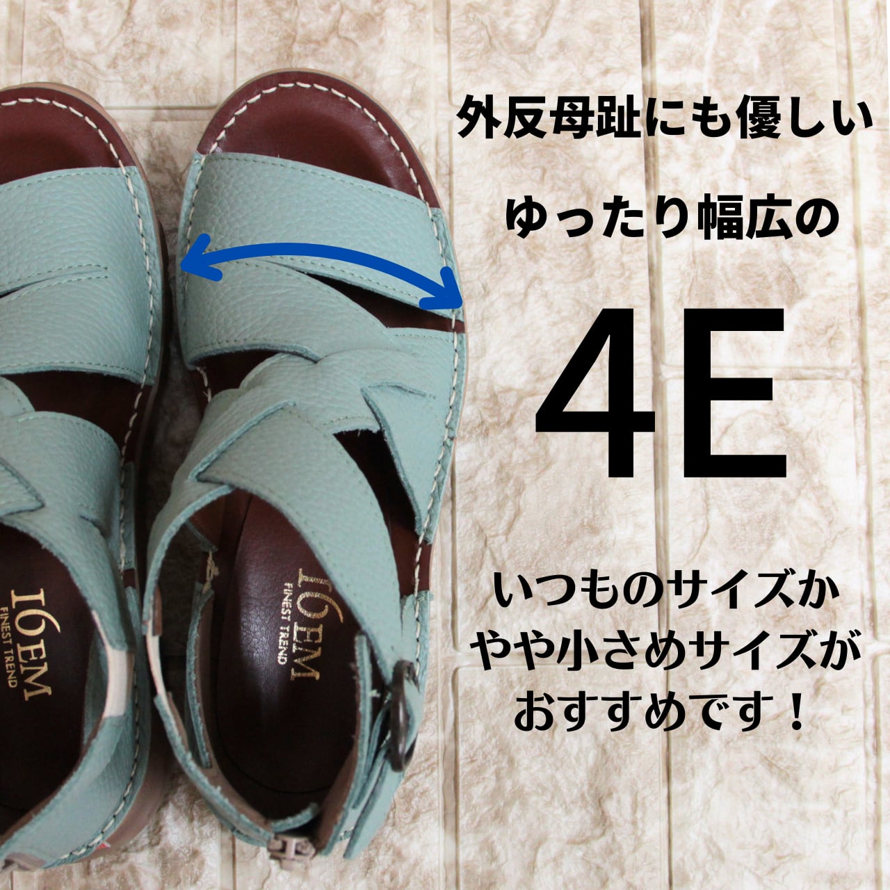 ワイズは幅広の4Eで甲周りの窮屈さを感じさせず、長時間の歩行での疲労も軽減。